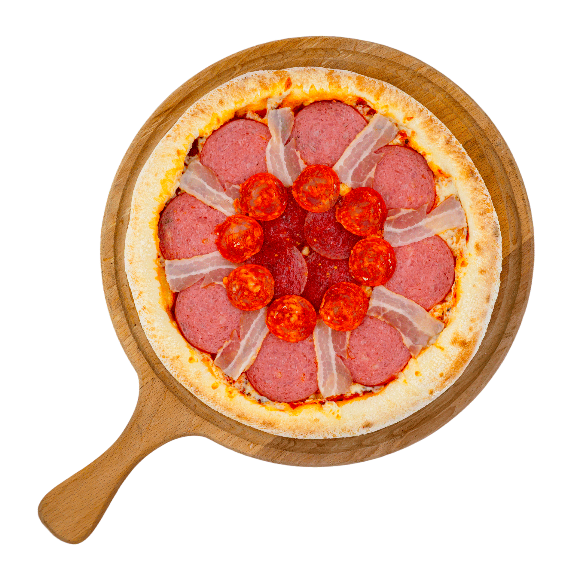 Колбаса п/к, колбаса с/к, ветчина, чоризо, бекон, соус томатный, моцарелла.