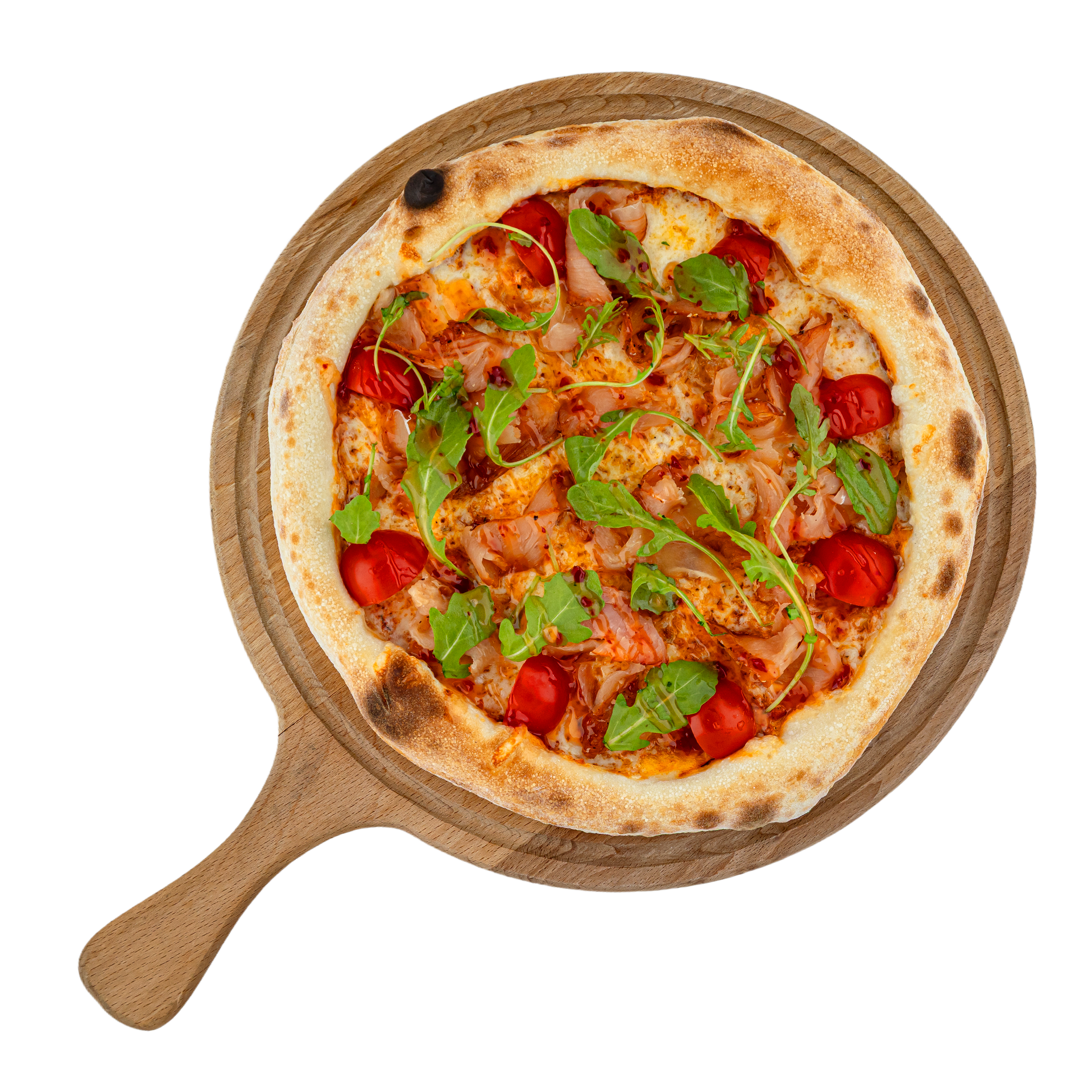 Тесто (мука, дрожжий, соль, сахар, вода, масло оливковое), томатный соус (томаты, соль, сахар, орегано, базилик, белый перец, масло оливковое), моцарелла, индейка сыровяленая, черри, соус сладкий чили, рукола.